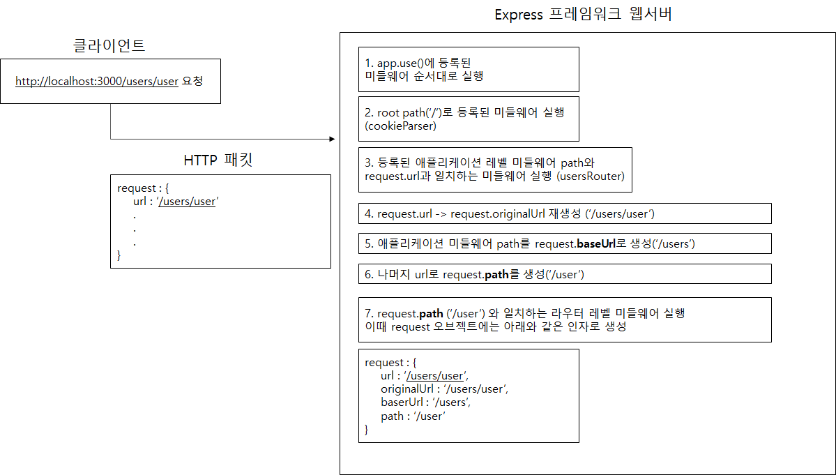 - 이 변수는 express 에서 동작하는 http module의 request.url라는 변수를 라우팅을 목적으로 재생성한 변수이다. (cookieParser 가 request.headers.cookie 를 request.cookies로 가공을 거쳐 재생성한 것처럼) 실제 클라이언트가 브라우저에 입력한 url을 뜻한다.